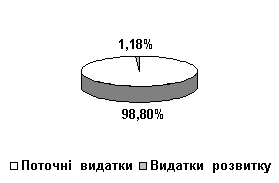 Аналізуючи фінансування видатків бюджету Новгородківского району, треба відзначити, що значну питому вагу у видатках займають поточні видатки (соціальний захист та соціальне забезпечення, соціально-культурна сфера, видатки на житлове господарство, видатки на утримання органів влади). Як показано на рис. 2.3, в 1996 році питома вага поточних видатків в загальних видатках бюджету становила 98,92 відс., і лише 1,18 відс. склали видатки розвитку (капітальні вкладення на розвиток виробництва і соціальної сфери, видатки на капітальний ремонт). В 1997 році поточні видатки склали 98,04 відс., видатки розвитку – 1,96 відс. Що ж стосується 1998 року, то поточні видатки за цей період становили 98,71 відс., а видатки розвитку –лише 0,29 відс.