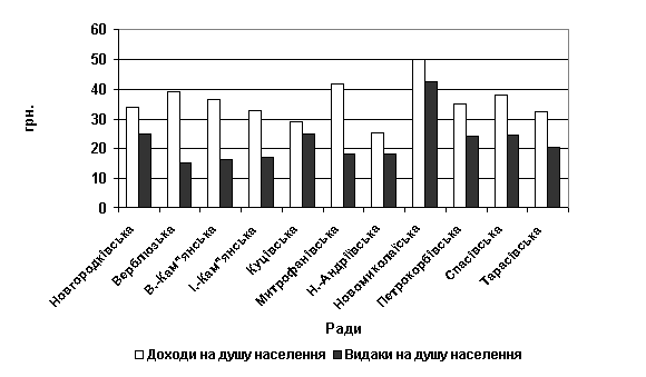 В результаті проведених досліджень формування місцевих бюджетів Новгородківського району виявлені досить серйозні розбіжності у співвідношеннях доходів і витрат на душу населення різних адміністративно-територіальних одиниць (рис. 3.3)