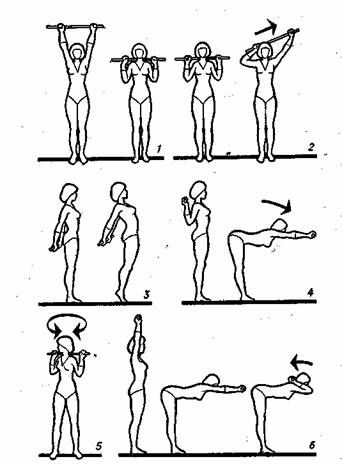 1. В.п.— стоячи, у витягнутих руках палиця. Занести палицю за спину, на лопатки, повернутись у вихідне положення. При нахилі — видих, у вихідному положенні — вдих. Повторити 8—10 разів.