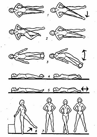 4. В.п.— лежачи на спині, ноги зігнуті в колінах з опором на ступні. По черзі відводити то одну, то другу ногу вбік з поверненням у вихідне положення. Повторити З— 4 рази кожною ногою.